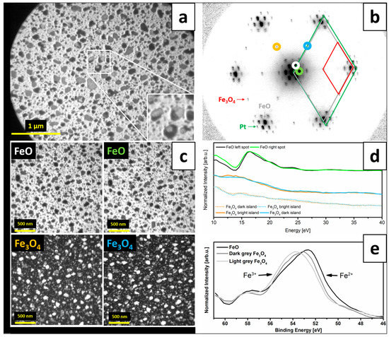 Figure 2a presents a LEEM image of iron oxide structures grown on Pt(111) by ~1.9 MLs iron deposition under UHV and subsequent oxidation in 1 × 10−6 mbar O2 at 900 K. For these particular support, iron coverage and oxidation conditions, a formation of a closed FeO(111) film with nucleating Fe3O4(111) islands on top, was expected [8]. Interestingly, at certain energies, three different contrasts were observed on the acquired LEEM images, visible as light grey and dark grey hexagonal and irregularly-shaped islands on a bright background (these structures can be seen more clearly in the inset to Figure 2a).