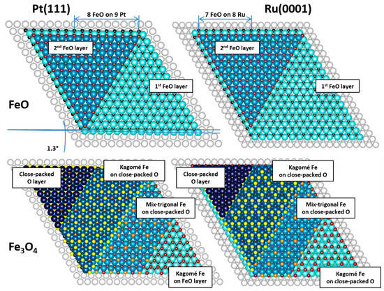 Schematic models of FeO(111) and Fe3O4(111) structures on Pt(111) and Ru(0001). The atoms in different iron and oxygen sublattices are partially removed to better visualize their different arrangement within different sublayers. The models were made using VESTA 3.4.3 computer software [25].