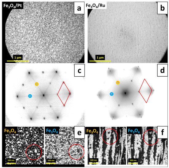 LEEM images (energy: 10 eV) (a,b) and µLEED patterns (energy: 42 eV) (c,d) of Fe3O4(111) films grown on Pt(111) (a,c) and Ru(0001) (b,d) by ~5.7 ML Fe deposition (total dose) under UHV at RT and post-oxidation in 1 × 10−6 mbar O2 at 900 K; the Fe3O4(111) unit cell is marked on µLEED patterns with red rhombus; (e,f) present DF-LEEM images obtained by mapping the diffraction spots marked with colors in (c) and (d), respectively (red circles mark the same sample position on respective images) (imaging energies: 15 (e) and 20 eV (f)).