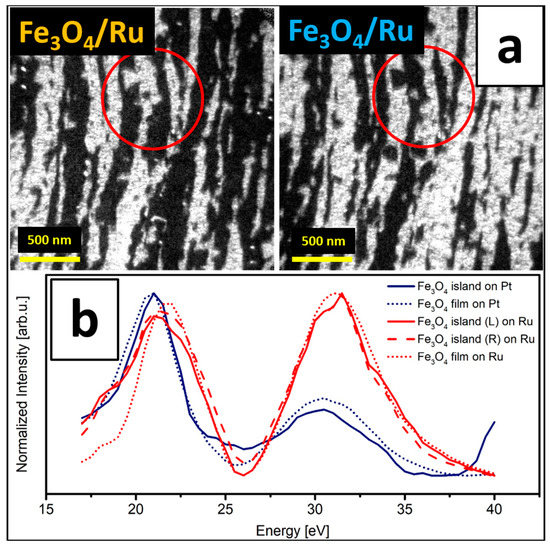 Interestingly, the LEEM-IV characteristics obtained for the initial Fe3O4(111) islands and for the multilayer magnetite films on Pt(111) and Ru(0001) were found to show a very similar character within the energy range of 17–40 eV (Figure 7b). The two peaks, centered at around 21 and 31 eV, were observed for all magnetite structures—regardless of the support and magnetite thickness. In particular, the 31 eV peak was explicitly observed for this iron oxide phase and may be used as a LEEM-IV-fingerprint of Fe3O4(111). LEEM-IV was already shown to be a reliable method for fingerprinting different iron oxide phases on Pt(111) and Ru(0001), however, usually the energy region of 0–30 eV was used in this respect [11,14,16]. In this region Fe3O4(111) shows very similar character to FeO(111) (with only a small difference in peak positions), that is why the peak at ~31 eV, which is observed only for magnetite, seems to be a more proper choice for fingerprinting this particular iron oxide phase.