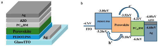 The device structure in this work is shown in Figure 1a, where the PEDOT:PSS and PCBM act as the HTL and ETL, respectively. Here an inverted planar heterojunction structure is used instead of the conventional structure due to its advantages as mentioned earlier. AZO is inserted between the PCBM layer and Ag electrode to decrease the energy mismatch between them, so that the carrier collection may be efficiently improved. Figure 1b shows the schematic band diagram of this work with/without AZO. The energy level mismatch between PCBM and Ag electrode could lead to inefficient carrier transport. One of the methods to enhance the performance of the p-i-n PSCs is interface engineering. It is expected that the AZO interlayer with excellent photoelectric properties can reduce the work function of metal electrode [25,26], so that the carriers can be efficiently collected by the Ag electrode, as shown in Figure 1b.