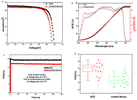 (a) Best performed J–V characteristics of PSCs with/without the AZO interlayer measured under 100 mW/cm2 AM 1.5G illumination. (b) IPCE curves and integrated current density of PSCs with/without the AZO interlayer. (c) Steady output characteristics of PSCs with/without the AZO interlayer. (d) Statistics result of PCE for PSCs with/without the AZO interlayer.