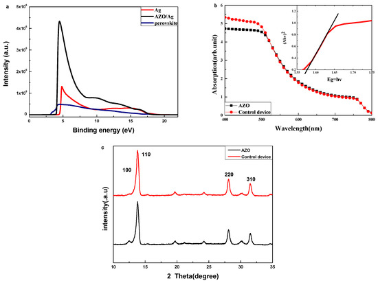 (a) UPS measurements of Ag electrode, Ag/AZO and ITO/PEDOT:PSS/perovskite. (b) The optical absorption spectra of ITO/PEDOT:PSS/perovskite/PCBM and ITO/PEDOT:PSS/perovskite/PCBM/AZO. inset: the corresponding bandgap of perovskite film. It is noted that the corresponding optical bandgap is about 1.58 eV. (c) XRD patterns of ITO/PEDOT:PSS/perovskite/PCBM and ITO/PEDOT:PSS/perovskite/PCBM/AZO.