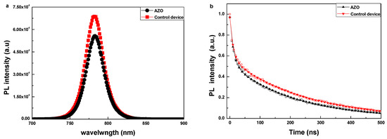 Figure 4a shows the steady-state photoluminescence (PL) spectra of the ITO/PEDOT:PSS/perovskite/PCBM layer with/without the AZO interlayer. The perovskite films were deposited on the glass/ITO/PEDOT:PSS substrates under the same experimental conditions. The excitation light wavelength is 700 nm and the PL emission is collected from the PCBM or PCBM/AZO side. To protect the samples during the measurement, the device was sealed by spin-coating a layer of insulating polymer (PMMA). When the sample has the AZO layer, it could be clearly observed that the peak intensity at 783 nm decreased, which demonstrates that the charge transfer from the perovskite to the ETL is more efficient. This indicates a suppressed non-radiative recombination with the optimized PCBM/AZO bilayer; this is consistent with the obtained UPS results and J-V characteristics discussed above. Figure 4b shows the TRPL behaviors for the sample with/without AZO layer. It is obvious that the sample with the AZO interlayer has a shorter lifespan, and that the sample without the AZO interlayer has a longer one. The lifespan for the sample without the AZO interlayer is around 239.08 ns; this is reduced to 201.84 ns when the AZO interlayer is inserted between the PCBM layer and the Ag electrode. This shows that the photogenerated charge carriers could be efficiently transported to the AZO layer and collected by the Ag electrode. All of these results indicate that efficient electron transfer occurs with the PCBM/AZO bilayer, which is necessary for efficient charge extraction and collection in PSCs, and corresponds with the higher performance and neglect photocurrent hysteresis for devices with the PCBM/AZO bilayer.
