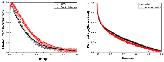The transient photocurrent and photovoltage measurements of PSCs were further performed to verify these results. Figure 4c shows the transient photocurrent of PSCs prepared with/without the AZO interlayer, measured at the short circuit condition. It was found that the device with the AZO interlayer has faster extraction (467.58 ns) than the device without the AZO interlayer (648.25 ns), indicating that the device former possesses much more efficient charge extraction and charge transport properties. Hence, the Voc and FF are enhanced. The transient photovoltage is used to determine the charge recombination lifetime, as shown in Figure 4d. The charge recombination lifetime of the device with the AZO interlayer increases to 0.41 ms, compared to that without the AZO interlayer (0.27 ms), indicating that the charge recombination is efficiently suppressed with the introduction of the AZO interlayer. These transient photocurrent and photovoltage measurement results are consistent with the PL measurement results.