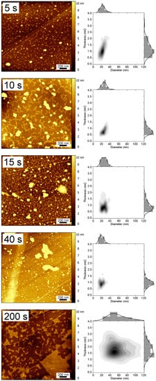 Tapping Mode Atomic Force Microscopy (TM-AFM) images of electrodeposited Pt samples prepared with different pulse durations are shown in Figure 1, together with their thickness and diameter distributions.