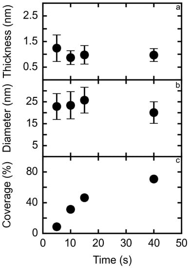 Similarly, the average nanoplatelet diameter did not vary greatly with the deposition time (Figure 2b) and the size distribution is reasonably similar for all the samples (Figure 1). Although the diameter of the platinum islands is comparable to some reported for other overpotential conditions [32], the present high overpotential conditions lead to a distinct geometry in that the diameter is roughly 20 times the thickness for samples in the 5–40 s time interval, confirming the presence of flat nanoplatelets and thus two-dimensional growth.