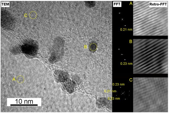 High resolution transmission electron microscopy (HRTEM) micrographs of a Pt on an HOPG sample electrodeposited using a 15 s pulse were acquired to confirm the chemical nature and morphology of the deposit (Figure 3). The dimensions of the nanoplatelets were around 10 nm. The Fast Fourier Transform (FFT) analysis on selected areas of the TEM image, shown in Figure 3, presents three regions denoted A, B, and C with different d-spacings for the regions where carbon (A) and platinum (B) were clearly distinguishable.
