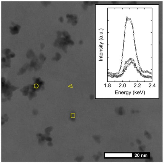STEM micrograph of a flake of HOPG decorated with Pt aggregates (○) and Pt nanoplatelets (□); the comparison of their EDX spectra with the apparent bare surface of HOPG (∆) is reported in the inset.