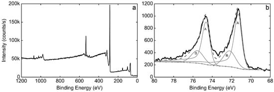 Surface analysis by X-ray Photoelectron Spectroscopy (XPS) was performed on a sample electrodeposited for 200 s both to further endorse the deposition of platinum, as well as to determine its oxidation state (Figure 5). The A bands of the Pt doublet observed on the sample (Pt 4f7/2 at 71.3 eV, Pt 4f5/2 at 74.6 eV) correspond to metallic Pt deposited on the HOPG surface. Additional contributions of B bands (72.2 and 75.5 eV respectively) were detected and related to the presence of oxidized forms of Pt, such as PtOads and/or Pt(OH)2 [39]. The deconvolution of the Pt 4f doublet peaks indicates that Pt0 is the majority species (73.6% of the total signal, comparable to Pt freshly electrodeposited onto graphite substrates previously reported [40]), rather than ionic Pt, which confirms the predominant metallic nature of the deposit and thus the suitability of the technique to prepare catalytically active Pt thin films.