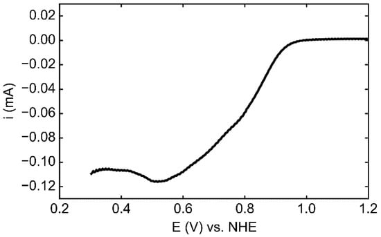 To assess the catalytic properties of the electrodeposited metal towards the oxygen reduction reaction (ORR), an HOPG-Pt sample deposited for 200 s was analyzed in O2 saturated 0.1 M HClO4 in a classical three-electrode configuration (scan from 1.2 to 0.3 V vs. NHE). The linear sweep voltammetry (LSV) shown in Figure 6 demonstrates that the deposited Pt0 is active, with an onset potential of ca 0.98 V vs. NHE. No reliable mass activity values could be derived due to the experimental conditions that are far from steady-state.