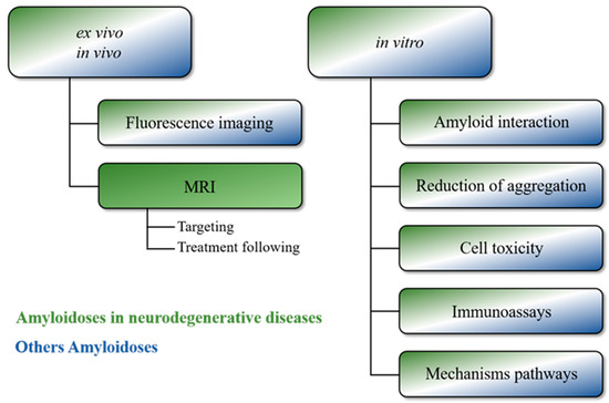 In this review, we summarize MNPs designed against various amyloidosis-related diseases for biomedical applications, taking into account that neurodegenerative diseases are more often priority targets. This purpose includes MNPs as detection platforms by sensitive imaging techniques mostly implicated in the fundamental understanding of amyloid aggregation as well as in amyloid detection and quantification for diagnosis and as an indicator for therapy follow up (Figure 1).