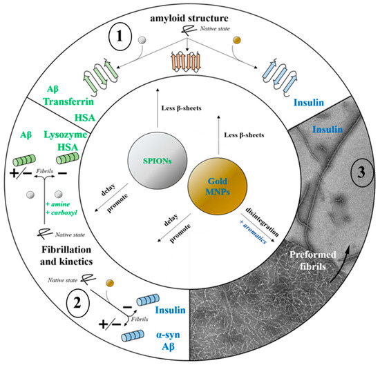 The most frequent outcome of studies on various amyloid proteins follows the same ascertainments, with an effect on nucleation and growth rate with or without an effect on preformed fibers. Hsieh et al. shows that AuNPs can affect insulin fibril formation by delaying fibrillation and modifying the elongation of fibers to make them much shorter and more compact [51]. These results suggest that MNPs can disturb the self-assembly process by acting directly on the β-sheet core. In addition, their functionalization with aromatic aminoacids may destabilize these insulin fiber architectures and may even trigger their disassembly in solution [52]. In contrast, similar kinetics assays, performed with AuNPs on α-syn proteins, showed faster and higher fibrillation inversely dependent on the nanoparticle size [53].