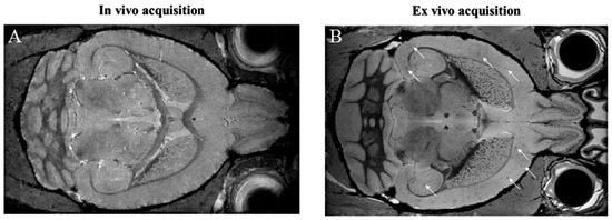 Efforts are engaged in an earlier diagnosis of the disease, and MRI is currently being investigated as a unique tool to achieve in vivo amyloid plaque imaging [85]. Indeed, a large proportion of amyloid plaques stores iron in their cores and therefore modifies the MRI signal in their surroundings, giving hypo-intense spots (a susceptibility effect) on T2 and T2* images [86,87,88]. The main problem that remains is that the required acquisition time for reaching a sufficiently high resolution (100 µm) to detect these spots is much too long (>2 h) for applying the technique to weak patients in a clinical routine even at a high magnetic field. However, this can be achieved in small animal models at a very high magnetic field with high performance sensors and long acquisition times allowing for very high resolution (<100 µm) [89]. Even under such conditions, this technique works well ex vivo after exsanguino-perfusion of the brains [90] while it remains difficult to perform in vivo as shown in Figure 3. This is because of the relatively lower spatial resolution achieved in vivo in reasonable scan times and also because of the competition between T2 hypo-signals originating from blood iron and iron contained in plaques.