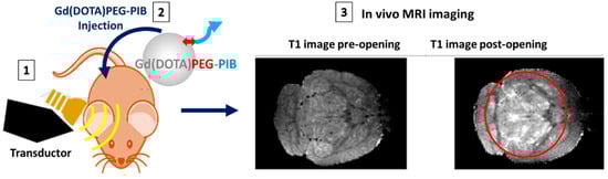 Ultrasound technology was applied via a transductor (1) on the brain of a transgenic mouse model of Alzheimer’s disease (APP/PS1 ΔE9) in order to increase the delivery of Gd(DOTA) grafted with PIB (Gd(DOTA)PEG-PIB) previously intravenously injected (2). The method consists of sonicating a large part of the brain, allowing for BBB disruption with a global intensity and on a high volume of brain, as observed in the post-ultrasound image compared to the prefrontal cortex (~+20%): MRI images show T1-weighted images pre- and post-BBB opening along with injection of Gd(DOTA)PEG-PIB (3). The MNPs signal appears as a hypersignal affecting the T1 relaxation time.