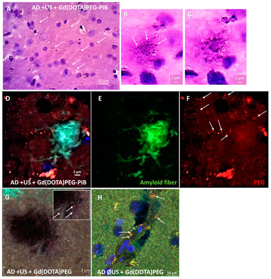 Immunohistological pictures of Gd(DOTA)PEG-PIB delivery inside cerebral tissue after blood–brain barrier (BBB) opening by ultrasound. (A–C) The images revealed the diffusion of MNPs into the brain using an antibody directed against the spacer PEG integrated in MNPs (brown spots) (A). Some of the Gd(DOTA)PEG-PIB were located in the vicinity of amyloid plaques (hematoxylin–eosin counterstaining) (B,C). (D–F) Confocal microscopy observations confirmed a close colocalization (D) between amyloid fibers ((E): thioflavin S staining (green)) and Gd(DOTA)PEG-PIB ((F): anti-PEG antibody revealed by secondary conjugated antibody Alexa-594 (red)). (G,H) For control, other AD mice were injected with MNPs without the amyloid-targeting PIB with (G) or without (H) prior ultrasound opening of the BBB; MNPs diffuse into the brain, but no specific accumulation around amyloid aggregates was observed (G), suggesting they remained localized in the vessel (H).