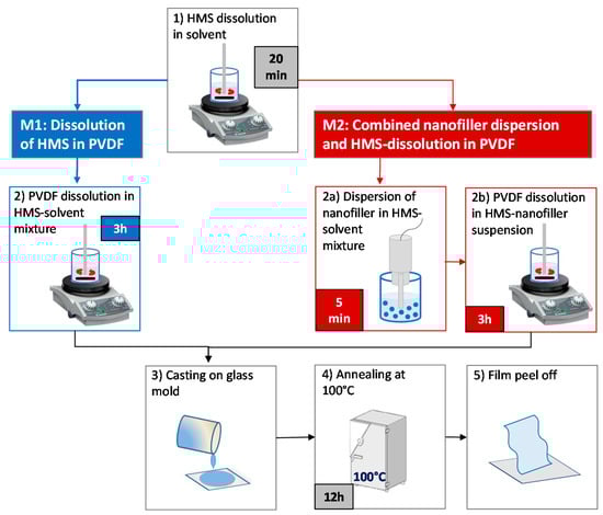 PVDF nanocomposite films were produced via a solution processing method as described in the experimental section above, using different types of HMSs eventually combined with a nanofiller (like GNPs or ZnO NRs) in order to enhance the piezoelectric response of the film. Two different methods were developed in order to produce large-scale PVDF film through the dissolution of HMS in PVDF (Method M1) or by combining HMS-dissolution and nanofiller dispersion (Method M2).