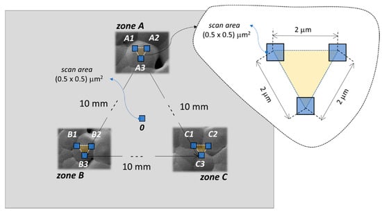 The piezoelectric properties of our samples were assessed through PFM [29] measuring the piezoelectric coefficient . For this purpose, we used a commercial Bruker-Veeco Dimension Icon AFM (Billerica, MA, USA) with a Co–Cr-coated-tip silicon cantilever (MESP-RC-V2, Bruker, Billerica, MA, USA) [22]. We applied to the tip an alternating voltage with the frequency of 15 kHz, and an increasing maximum amplitude Vac of 2, 4, 6, 8, or 10 V. The bottom electrode of the samples was grounded. We scanned 10 different areas (500 × 500) nm2 in size, with 256 × 256 acquisition points per scanning area, and with a scan rate of 0.5 Hz. The 10 scanning areas were located in four different zones of the sample surface, as shown in Figure 2. The first scanning area (labeled “0” in Figure 2) was located in the center of the sample, and was used as an approach area needed to verify whether the sample had a piezoelectric response. The next 9 scanning areas were located in three different zones of the sample surface, 10 mm apart from each other, as shown in Figure 2. Two out of the three zones (Zone A and Zone B) are selected in proximity of the center of two different spherulites, whereas the third one includes the valley between two adjacent spherulites. This choice was made in order to characterize the piezoresponse of areas of the sample with different morphologies and characteristics, with the aim of getting information about the uniformity of the piezoresponse over the whole sample surface.