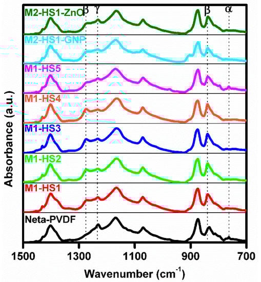 As is well known from the literature [12,25,34], the characteristic FT-IR peaks of the α-phase are located in the range between 1423 and 763 cm−1, those of the β-phase at 1275 cm−1 and 840 cm−1, and those of the γ-phase at 1234 cm−1.