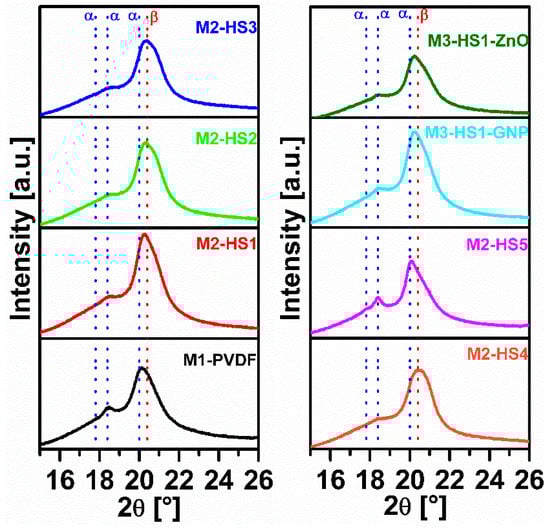 X-ray powder diffraction (XRPD) patterns acquired on the produced samples of PVDF nanocomposites.