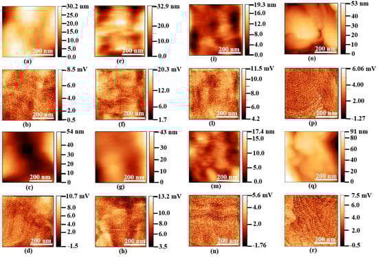 Morphological maps and vertical (out-of-plane) PFM signals at Vac = 10 V and at 15 kHz for Neat-PVDF (a,b), for M1-HS1 (c,d), for M1-HS2 (e,f), for M1-HS3 (g,h), for M1-HS4 (i,l), for M1-HS5 (m,n), for M2-HS1-GNP (o,p), and for M2-HS1-ZnO (q,r).