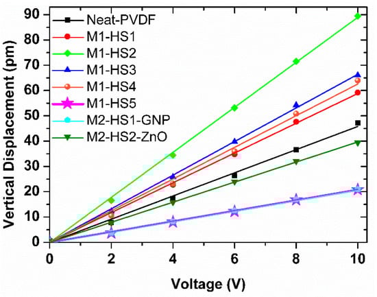 Next, we evaluated the average amplitude of the measured vertical displacement for each sample as a function of the amplitude (Vac) of the applied alternating voltage. The obtained data, which are averaged over 10 scanning areas, and the corresponding linear fits are reported in Figure 8. The slope of the straight lines interpolating the measured data is the piezoelectric coefficient d33.