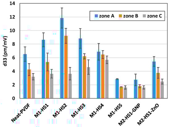 We computed the global average value of the piezoresponse coefficient for each sample, according to Equation (6). The obtained values, including the corresponding standard deviations, are reported in Table 2. It is confirmed that the highest piezoresponse is observed in sample M1-HS2. In this case, the standard deviation varies in the range 30–40% since it is representative of the local variation of d33 over the sample surface.