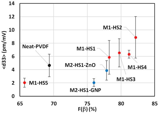 In addition, Figure 10 shows as a function of [23]. As expected from FT-IR and XRPD data, we notice that when we dissolve the HMS into PVDF, the piezoelectric coefficient increases. Indeed, the maximum value of = (8.88 ± 3.145) pm/V was observed in sample M1-HS2, which is also characterized by the highest value of , while the lowest value of = (2.047 ± 0.69) pm/V was observed in sample M1-HS5, in agreement with the FT-IR and XRPD data showing the lowest β-phase fraction.