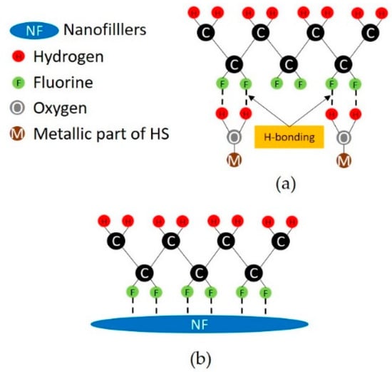 Schematic representation of (a) the formation of H-bonding with the metallic part of HS and the CF2 group of PVDF, and (b) the electrostatic interaction between the nanofillers (either GNP or ZnO NRs) and the CF2 group of PVDF.