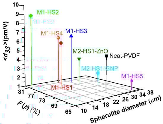 The incoherent interaction between HMS and nanofiller induces an incoherent distribution of the β-phase polymer chains, resulting in a poor d33 signal. Furthermore, we observe that in most samples, when the average value of the spherulite diameter decreases, the piezoelectric coefficient of the PVDF nanocomposite films increases (Figure 12). This trend is also observed with respect to the fraction of the β-phase, .