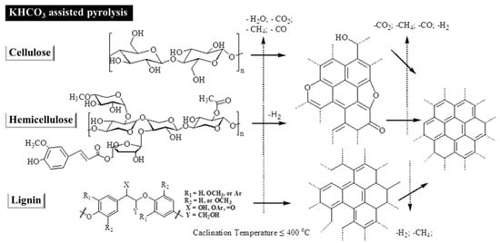 Possible carbonization routes of cellulose, hemicellulose and lignin in the presence of KHCO3 (reproduced from [], with permission from American Chemical Society, 2016).