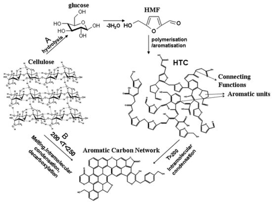 Conversion of cellulose to aromatic carbons under hydrothermal carbonization (HTC) conditions (reproduced from [], with permission from The Royal Society of Chemistry, 2012).