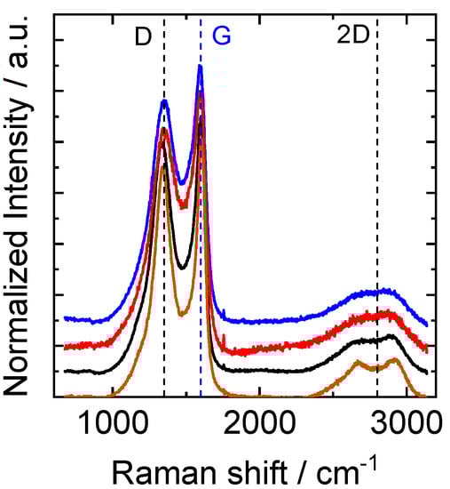 - Cuesta, A.; Dhamelincourt, P.; Laureyns, J.; Martínez-Alonso, A.; Tascón, J.M.D. Raman microprobe studies on carbon materials. Carbon N. Y. 1994, 32, 1523–1532. [Google Scholar] [CrossRef]