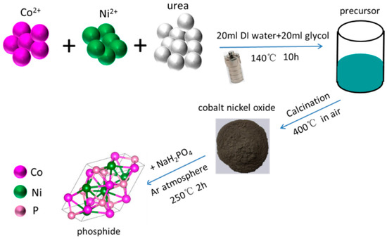 The porous phosphide catalysts were prepared in three steps as the displayed in Figure 1. Firstly, NiCl2·6H2O (0 mmol, or 0.66 mmol, or 1 mmol, or 1.33 mmol), CoCl2·6H2O (2 mmol, or 1.33 mmol, or 1 mmol, or 0.66 mmol) and urea (0.2 g) were dissolved in a solution containing 20 mL deionized (DI) water and 20 mL glycol to form a transparent solution. Then, the solution was transferred into a 50-mL Teflon-lined autoclave and then kept in an oven at 140 °C for 10 h. The resulting precipitate precursors were gathered and cleaned with ethanol and DI water for several times. Secondly, the precursors were calcinated at 400 °C for 2 h in air, and black cobalt nickel oxides were obtained. Thirdly, the superfluous NaH2PO2 with the cobalt nickel oxides were mixed well and then heated to 250 °C for 2 h in Ar atmosphere. The final products were washed several times with DI water and ethanol.