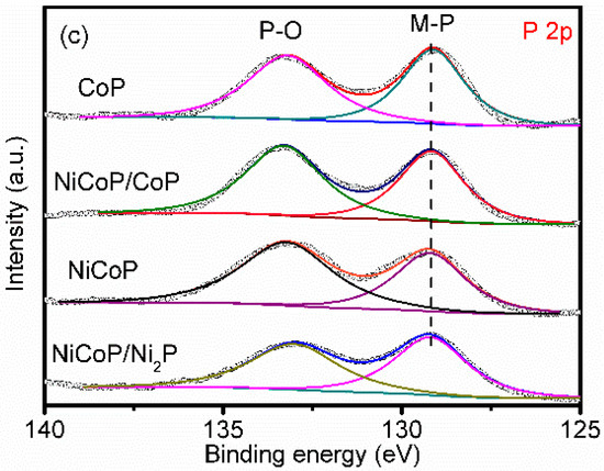 To further investigate the effect of the molar ratio of Ni/Co on the products, XPS measurement of the phosphides was carried out. Figure 4a–c shows XPS spectra of Co (2p), Ni (2p) and P (2p) for the CoP, NiCoP/CoP, NiCoP and NiCoP/Ni2P, respectively. The Ni 2p3/2 peak can be fitted with three peaks at 853.1, 856.35 eV and 861.55 eV that correspond to Ni in Ni2P or NiCoP, Ni oxides species and the satellite peak, respectively [8,17,31,32,33]. For the CoP sample, the peaks of Co 2p3/2 located at 778.2 and 782.0 eV correspond to the Co-P bond and Co oxides, respectively [29,34,35]. For the other three samples, the peaks located at 778.50 eV for Co are ascribed to the Co-P bonds in NiCoP. The blue shift (0.22 eV) of Co 2p3/2 peak shows unambiguously that Co has a strong coupling effect and change the surface electronic landscape [36,37]. Besides, the binding energies of P 2p region show a presence of two peaks at 129.1 and 133.2 eV belonged to metal phosphide bonds and P oxides, indicating that P is not involved in the process of adjusting multi-coupling synergetic effects in all samples [14,34,38]. The observation of oxide species of Co, Ni and P in the XPS results is due to the spontaneous oxidation of samples exposed to air [39]. All these results demonstrate that the products were CoP, NiCoP/CoP, NiCoP and NiCoP/Ni2P when the Ni/Co ratios were 0, 0.5, 1, and 2, respectively.