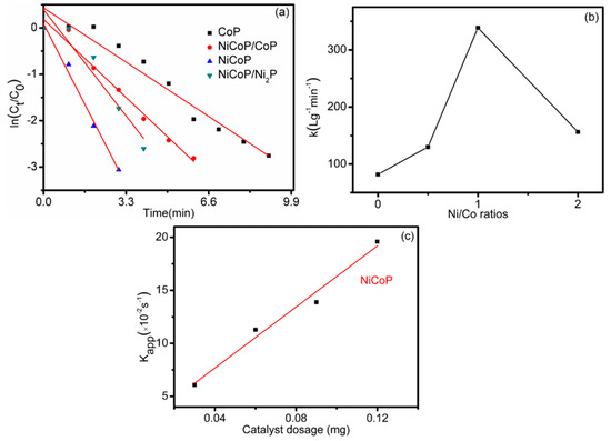 where is the absorbance at 400 nm at time t; is the initial absorbance of the reactants; t is the reaction time; is the apparent rate constant (s−1), respectively. Thus, the apparent rate constant (), which is determined by the spectrophotometric data, can give information on the reaction rate [45]. Figure 9a illustrates the relationship of versus reaction time plots in presence of 0.06 mg catalysts. The observed for NiCoP, NiCoP/Ni2P, NiCoP/CoP and CoP is , , and , respectively. In addition, the effect of different catalyst dosages for 4-NP reduction is also investigated. Therefore, the parametric is measured, which is related to the catalyst amount, and is defined as [46]: