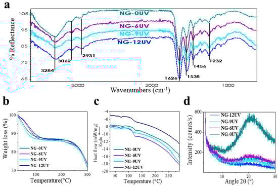 The FTIR spectra of GelMA mats showed typical peaks of gelatin (Figure 2a) as described for GelMA. On the other hand, TGA thermograms in Figure 2b show the thermal degradation behavior of GelMA mats. All samples showed a small loss of mass in the range of 50 °C to 120 °C, probably caused by the loss of water molecules. At temperatures above 150 °C, the degradation of biopolymer started for all samples. In addition, their onset points of degradation increased slightly with the time exposed to UV irradiation. Probably, it is due to an increase in the crosslinking degree.