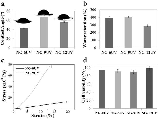 In order to confirm the crosslinking, the mechanical properties of NG-9UV and NG-0UV nanofiber mats were tested (Figure 3c). A uniaxial tensile testing was performed and the Young’s modulus (YM) was determined for both matrices. YM value of NG-9UV sample was seven times higher than the measured for NG-0UV (0.717 ± 0.001 MPa and 4.89 ± 0.03 MPa, respectively). Thus, the crosslinking methodology used in this work for GelMA curing was successful. Moreover, a relationship between the morphological/chemical properties and UV irradiation time was observed. Thus, a UV irradiation time of 9 min was chosen for further studies, according to the obtained results.