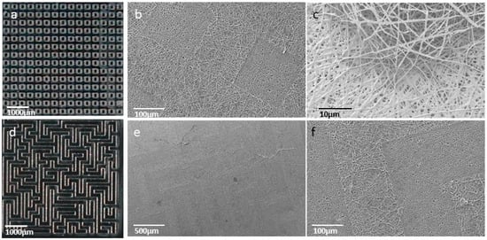 Once molds were fabricated, micropatterned nanofibrous scaffolds were obtained. The electrospun mats were collected over micropatterned molds and then they were peeled out carefully. GelMA nanofibrous mats were obtained using five different types of surface topographies: concentric-circles, dot, parallel-lines, random-lines (maze), and squares. After crosslinking, samples were examined by SEM. The electrospun mats successfully reproduced the micropatterned design of the molds, keeping the nanofibrous structure when the size of structures are 200 µm or more. Two of the micropatterned designs are shown in Figure 5.