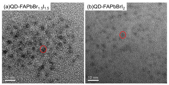Figure 2 shows the TEM (transmission electron microscopy) (Tecnai F30, Philips, Netherlands) images of the QD-FAPbBr1.5I1.5 and QD-FAPbBrI2 thin films. It is clear that the QD-FAPbBr1.5I1.5 and QD-FAPbBrI2 thin films are composed of many quantum dots, in which the quantum dot sizes ranged between 7 nm and 10 nm.