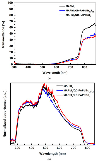 (a) Transmittance and (b) absorbance spectra of the MAPbI3, MAPbI3/QD-FAPbBr1.5I1.5, and MAPbI3/QD-FAPbBrI2 films.