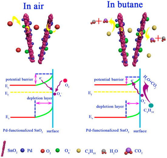 - Dong, C.J.; Jiang, M.; Tao, Y.; Shen, Y.Y.; Lu, Y.X.; Yuan, Y. Nonaqueous synthesized of Pd-functionalized SnO2/In2O3 nanocomposites for excellent butane sensing properties. Sens. Actuators B 2018, 257, 419–426. [Google Scholar] [CrossRef]