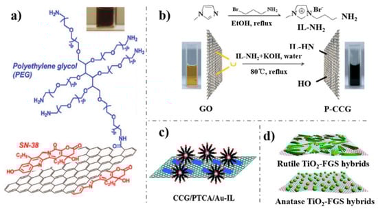 (a) Schematic drawing of PEG-NGO; (b) IL-RGO; (c) Graphene-PCTA-Au-IL; (d) TiO2-graphene hydrids nanostructures. Reproduced from [43] (a), with permission from American Chemical Society, 2008; Reproduced from [44] (b), with permission from The Royal Society of Chemistry, 2009; Reproduced from [45] (c), with permission from The Royal Society of Chemistry, 2009; Reproduced from [46] (d), with permission from American Chemical Society, 2009.