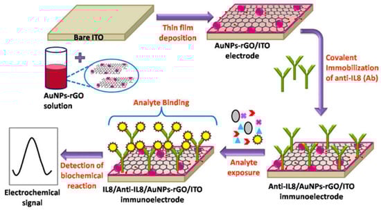 Schematic of fabrication of Au NPs-rGO-based immunoelectrode for immunosensing application. Reproduced from [59], with permission from American Chemical Society, 2017.