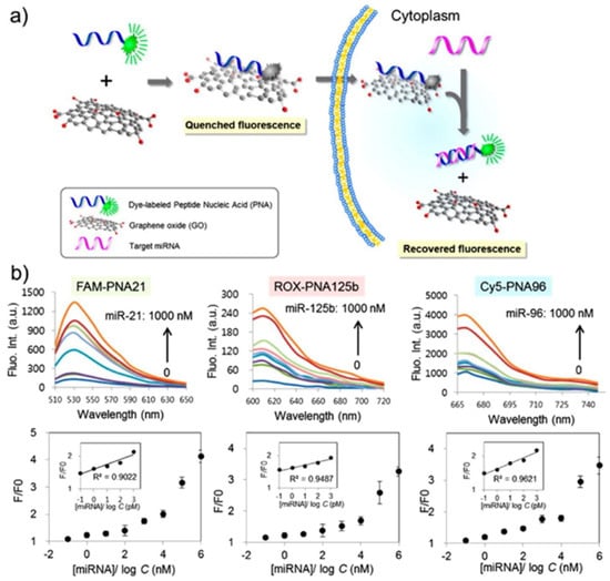 Optical biosensing has become a prevailing technology in biomedical diagnostics, which contains fluorescence, colorimetric, interferometric, and surface plasmon resonance (SPR) biosensors. The optical tunability of nanographene and its derivatives are advantageous in optical biosensing. Meanwhile, recognition molecule are involved in a reversible link–delink process on the graphene surface, which is the basis of designing specific optical biosensors. Qu et al. developed a naked-eye readout colorimetric immunoassay for PSA detection based on the intrinsic peroxidase activity of GO [115]. Compared with absorbance-based biosensing, fluorescence biosensing is much more sensitive (~1000 times higher) to enabling single-molecule detection [116]. As shown in Figure 6, NGO was applied to absorb dye-labeled peptide nucleic acid by Ryoo et al., which exhibited quenched fluorescence signal [117]. When target mRNA was added, the nucleic acid demonstrated higher affinity towards mRNA than NGO, which led to the recovery of the signal. The detection limit was as low as ~1 pM, and three different mRNAs in a living cell were simultaneously monitored. The dynamic changes of mRNA expression level are associated with disease type and stage, which allowed the constructed mRNA bioimaging to diagnose the early stage of cancer cells with high precision and discrimination power. Similar works to discover biomarkers of prostate and bladder cancer were reported by Kanara group [118] and Xia’s group [119].