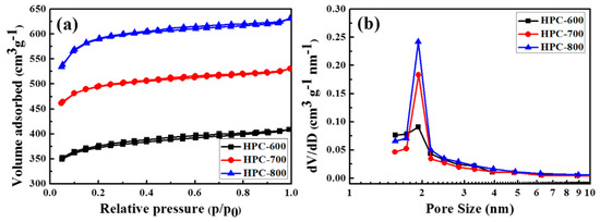 The specific surface area and porous structure of the HPCs were characterized by N2 adsorption-desorption technique. In Figure 4a, all the HPCs exhibit typical IV isotherms with a large hysteresis loops at relative pressures p/p0 > 0.5, suggesting the generation of massive mesopores. At low relative pressures p/p0 < 0.1, the isotherms have certain vertical displacement increase, indicating the presence of limited micropores. At high relative pressure p/p0 > 0.9, an obvious rise of the isotherms can be attributed to the presence of few macropores, which is in agreement with the results of the SEM images [23]. That is to say, all the HPCs exhibited hierarchical porous structures: limited micropores, abundant mesopores, and few macropores. Table 1 exhibits details of the textual characteristics of the HPCs. The Brunauer–Emmett–Teller (BET) surface area of HPC-600, HPC-700, and HPC-800 are 1136.6, 1506.5, and 1812.4 cm2·g−1, respectively. The KOH activation temperature had an outstanding impact on developing the micropore structure [24]. As the KOH activation temperature was raised from 600 to 800 °C, new micropores emerged and the ultra-micropores were enlarged, leading to higher surface area and large total pore volume (see Table 1). The total pore volumes of HPC-600, HPC-700, and HPC-800 were 0.63, 0.82, and 0.98 cm3·g−1, respectively. The pore size distribution of the HPCs was further demonstrated by the BJH method, as shown in Figure 4b. As the KOH activation temperature increases, the average pore diameter changes from 1.89 to 1.92 nm. This indicates that the mesopores were widened and micropores were grown by KOH etching under harsh activation temperature [25].