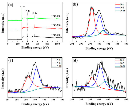 X-ray photoelectron spectroscopy (XPS) survey spectra (a); N 1s spectra of the HPC-600 (b); HPC-700 (c); and HPC-800 (d).