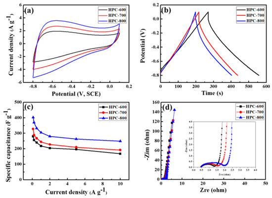 Electrochemical performance of all the HPC electrodes measured in a three-electrode system: (a) Cyclic voltammetry (CV) curves at a scan rate of 10 mV·s−1; (b) Galvanostatic charge/discharge (GCD) curves at a current density of 1 A·g−1; (c) specific capacitances at different current densities; and (d) Nyquist plots and inset magnified image.