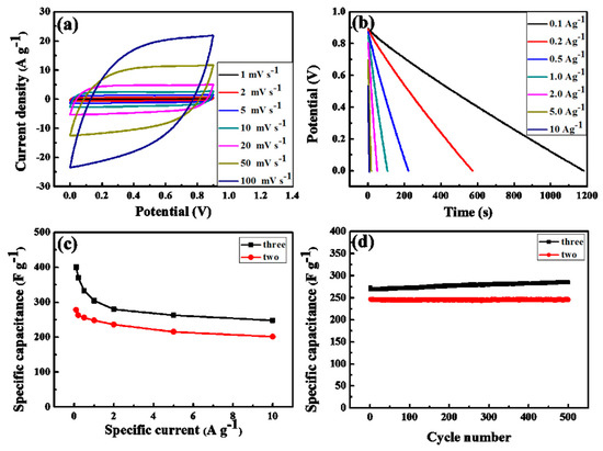 The working electrodes were prepared by mixing 80 wt % the nitrogen-doped HPCs as an active material, 10 wt % acetylene black as a conductive agent and 10 wt % poly (tetrafluoroethylene) as a binder. The paste were pressed on a nickel foam current collector under a pressure of 8 MPa. The mass loading of the active material was in between 4 and 5 mg·cm−2. Electrochemical measurements were measured in a three-electrode system and a two-electrode system, respectively. In a three-electrode system, platinum sheet and saturated calomel electrode (SCE) were used as the counter electrode and the reference electrode, respectively. In a two-electrode system, the two electrodes of nearly the same mass and area were separated by a polypropylene film. Cyclic voltammetry (CV), galvanostatic charge/discharge (GCD), and electrochemical impedance spectroscopy (EIS) were measured in a 6 M KOH electrolyte with the electrochemical workstation CHI 660E instrument (Shanghai CHI Apparatus Co. Ltd., China).