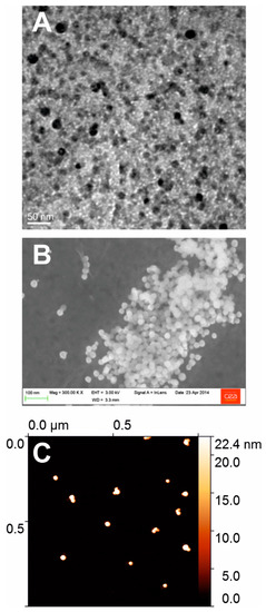 Gray scale images of nanosphere™ standard polystyrene particles of 22 ± 2 nm in diameter: (A) black particles in TEM image of 0.48 × 0.48 μm²; (B) white particles in SEM image of 1.0 × 0.67 μm²; and (C) white particles in AFM height image of 1 × 1 μm² where the height scale is represented by a false-color gradient on the right-hand side.